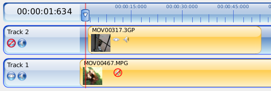 And, to continue the trend of progress, here are some screenshots of two new features, the mute button and the visibility button. As you can see, both the track and the clip now have 2 icons (i.e. clickable image buttons). If you click on the mute button, it will not play the audio, and if you click on the visibility button, it will not play the video (but the audio will still play). If you click both buttons, then nothing will play for the clip (which begs the question, why did you put the clip there?).